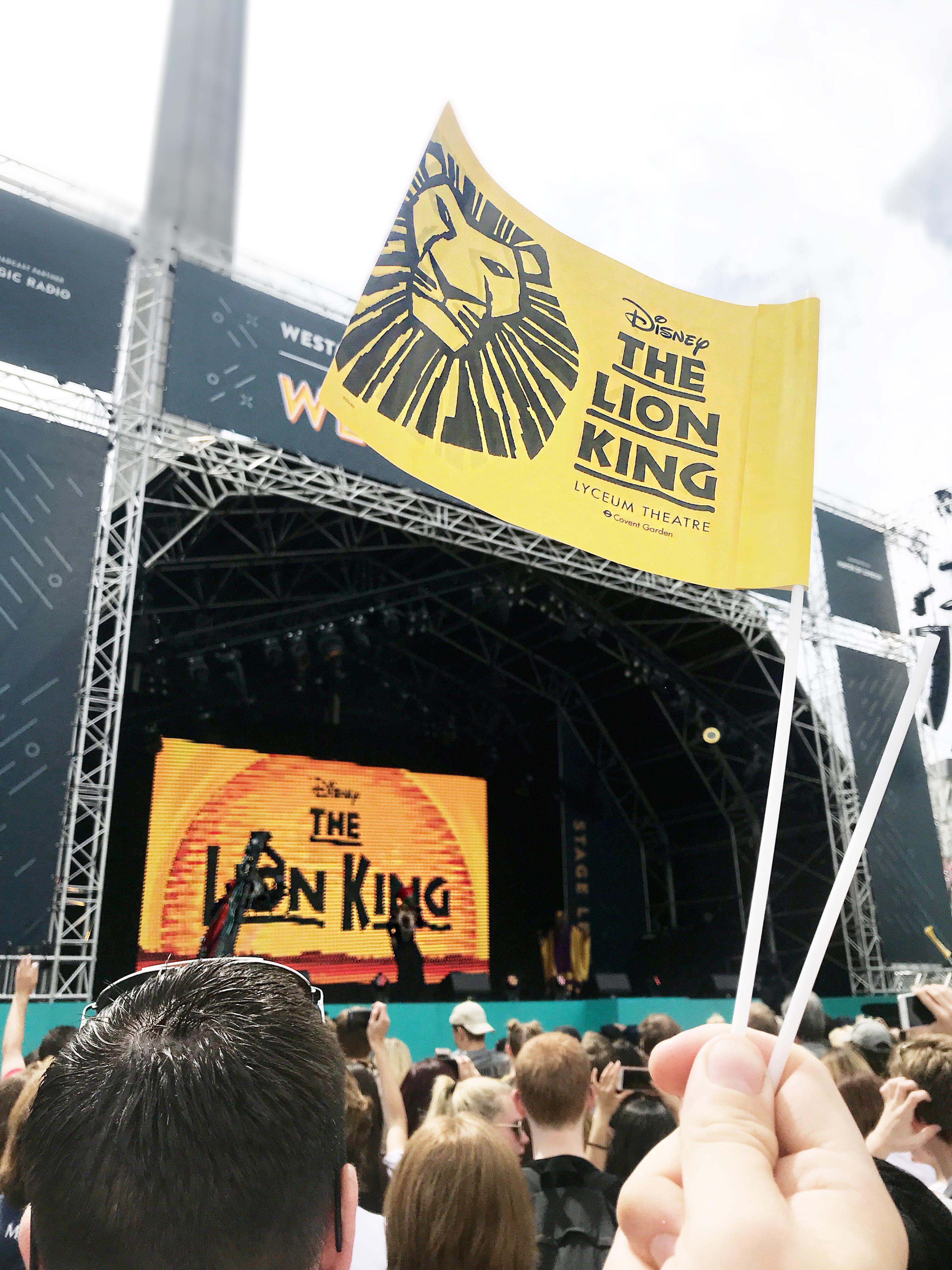 One of the highlights of the Sunday lineup was Disney’s The Lion King. The show has been running in London for nearly two decades and their performance proved the show is still a crowdpleaser. The cast performed the songs “Circle of Life”, “Can You Feel The Love Tonight?” and “He Lives In You” in their Act 2 opening outfits. I think it was also a great decision that free flags of the show were given out during the queue line as it was great to see a crowd full of waving yellow flags.